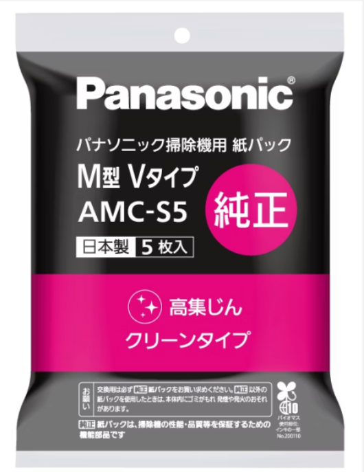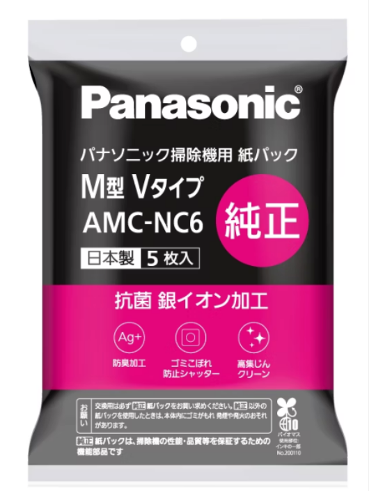 A. パナソニックのキャニスターシリーズの場合、高集じんタイプ、消臭・抗菌加工の「逃がさんパック」AMC-HC12(3枚1パック)、消臭・抗菌加工のAMC-NC6(5枚1パック)、ベーシックタイプのAMC-S5(5枚1パック)などが案内されていて用途とご予算に応じて選べるようになっています。