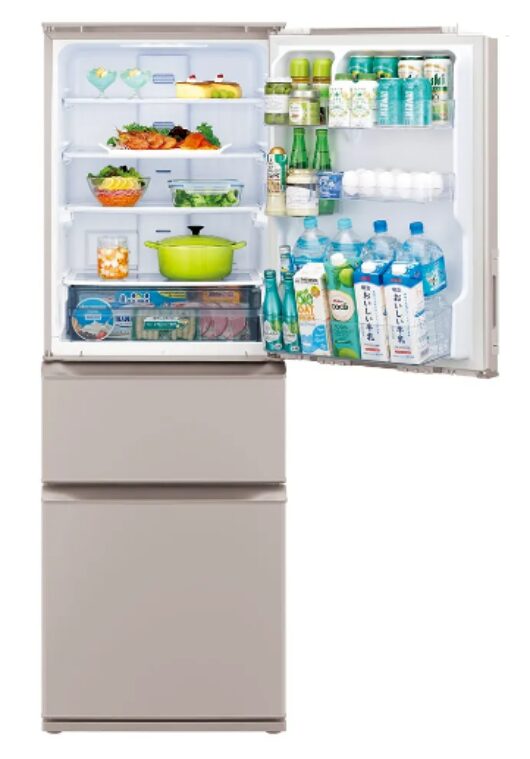 この2機種は、冷蔵室207Lに対して冷凍室97Lと、冷蔵と冷凍のバランスがよい構成です。毎日スーパーに行くというより、数日分をまとめて保存したい方に向いています。特に3段&段違いケースがあるため、食材を種類ごとに分けやすく、奥に埋もれにくいのがメリットです。反対に、冷凍をとにかく大量に使うご家庭では、より冷凍室が大きい上位モデルのほうが向く場合もあります。自分の暮らしで「よくパンパンになるのは冷蔵室か冷凍室か」を思い出すと選びやすいです。